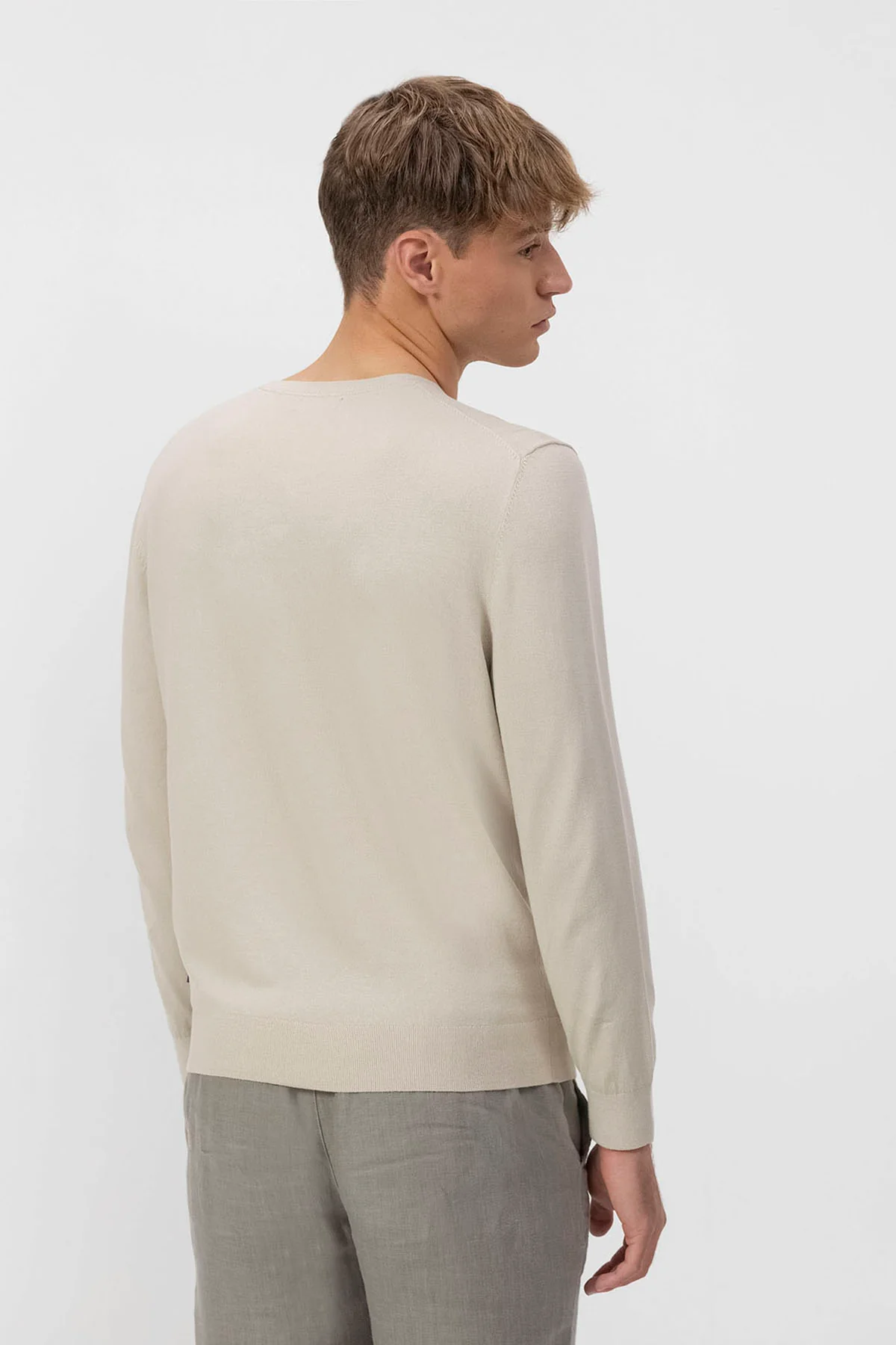 Jersey básico cuello redondo en blanco roto. Confeccionado en 85% viscosa y 15% nylon. Logo elPulpo bordado en el pecho a tono. Rib en escote, puños y bajo. Regular fit.